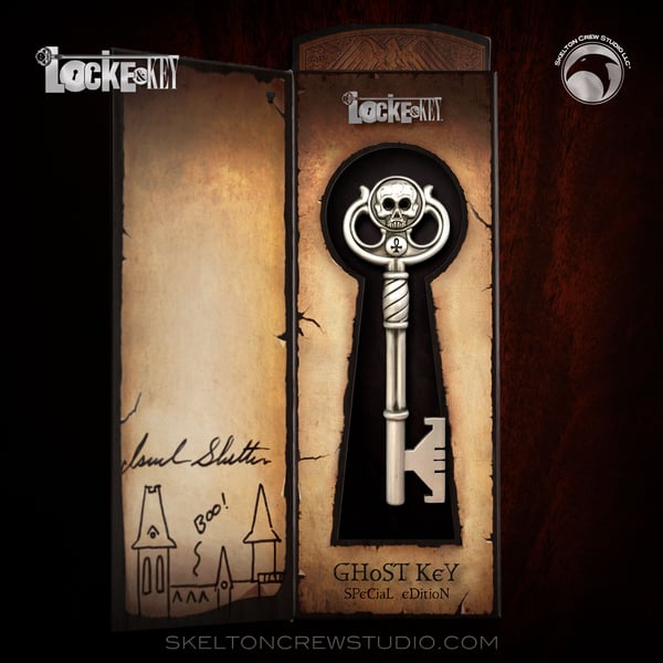 Cast in antique pewter-plated solid metal, it's packed in a custom Ghost Door box with keyhole window.
