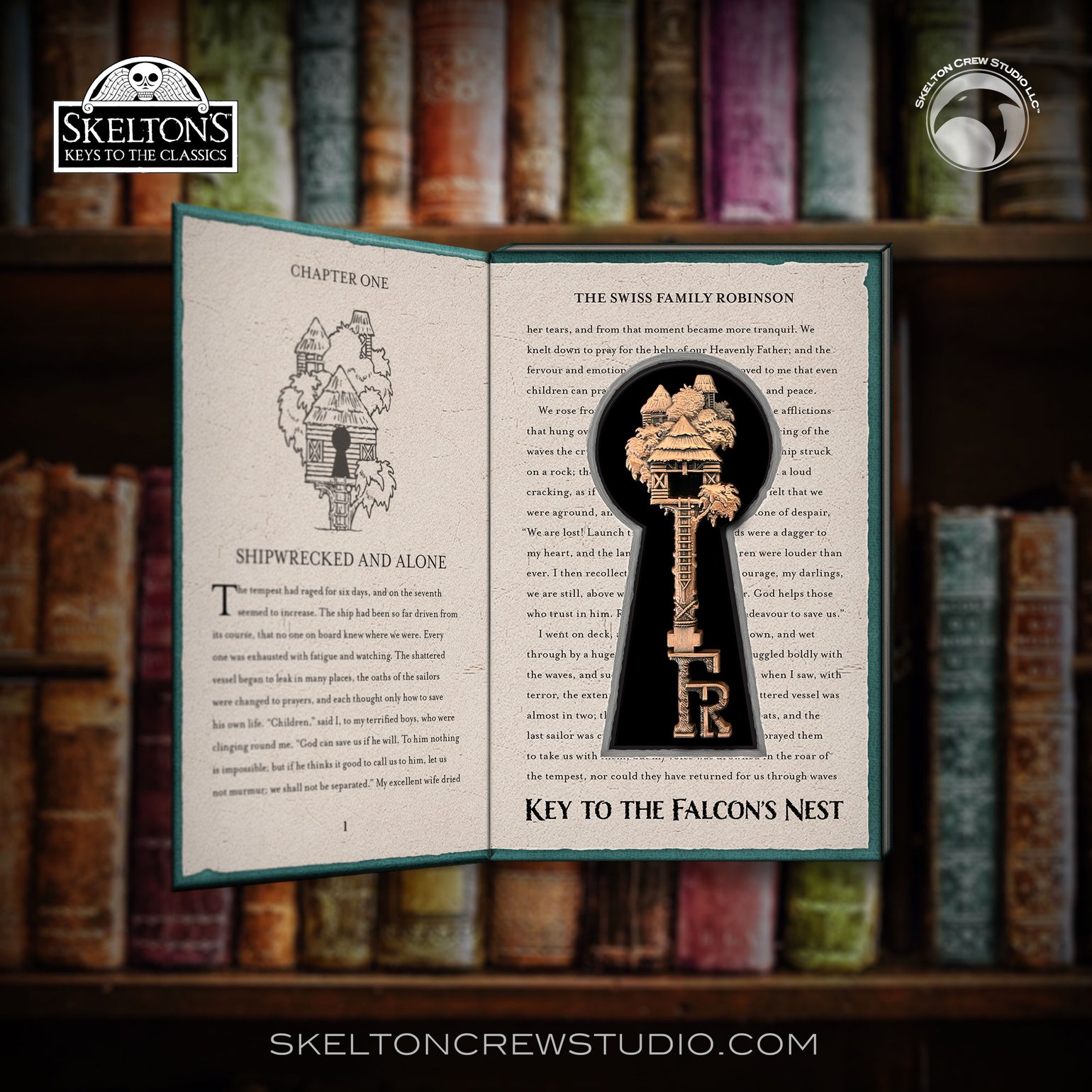 The Key to the Falcon's Nest is cast in an antique copper-plated solid metal and nestled in a custom book-look box featuring the opening lines to Johann David Wyss' classic, "The Swiss Family Robinson."